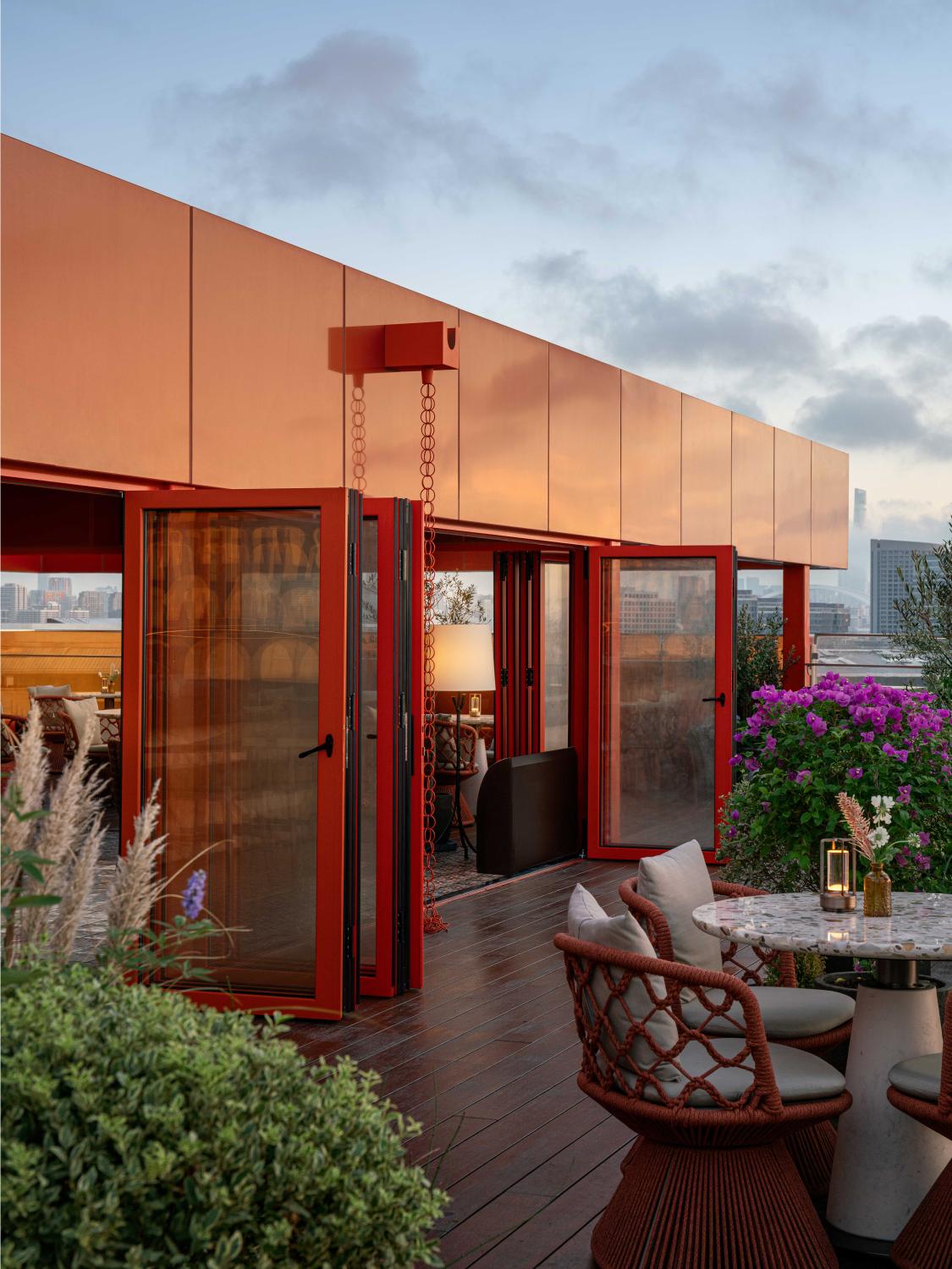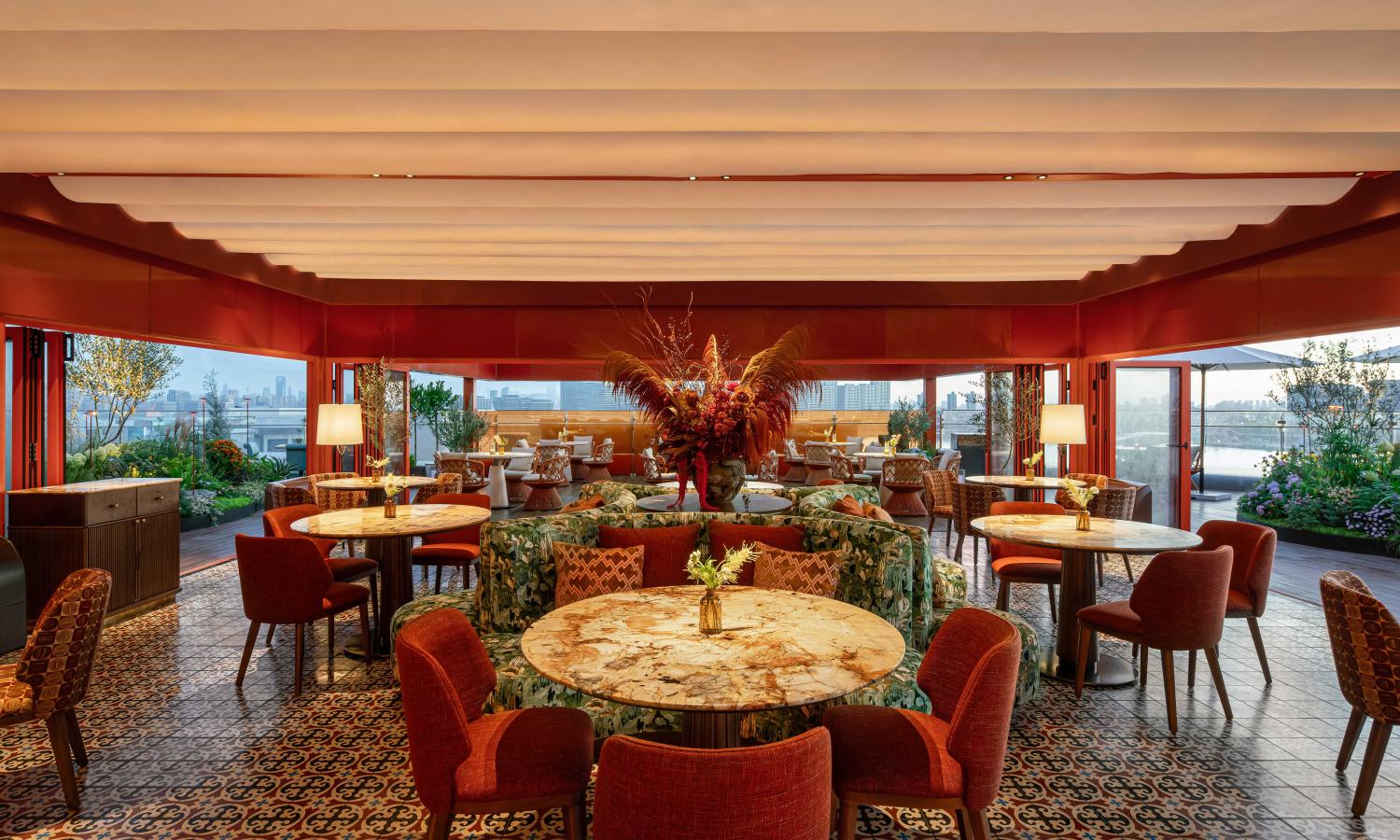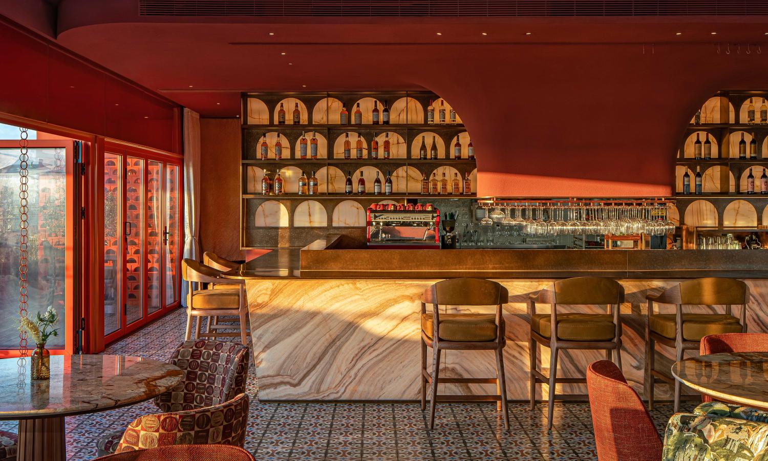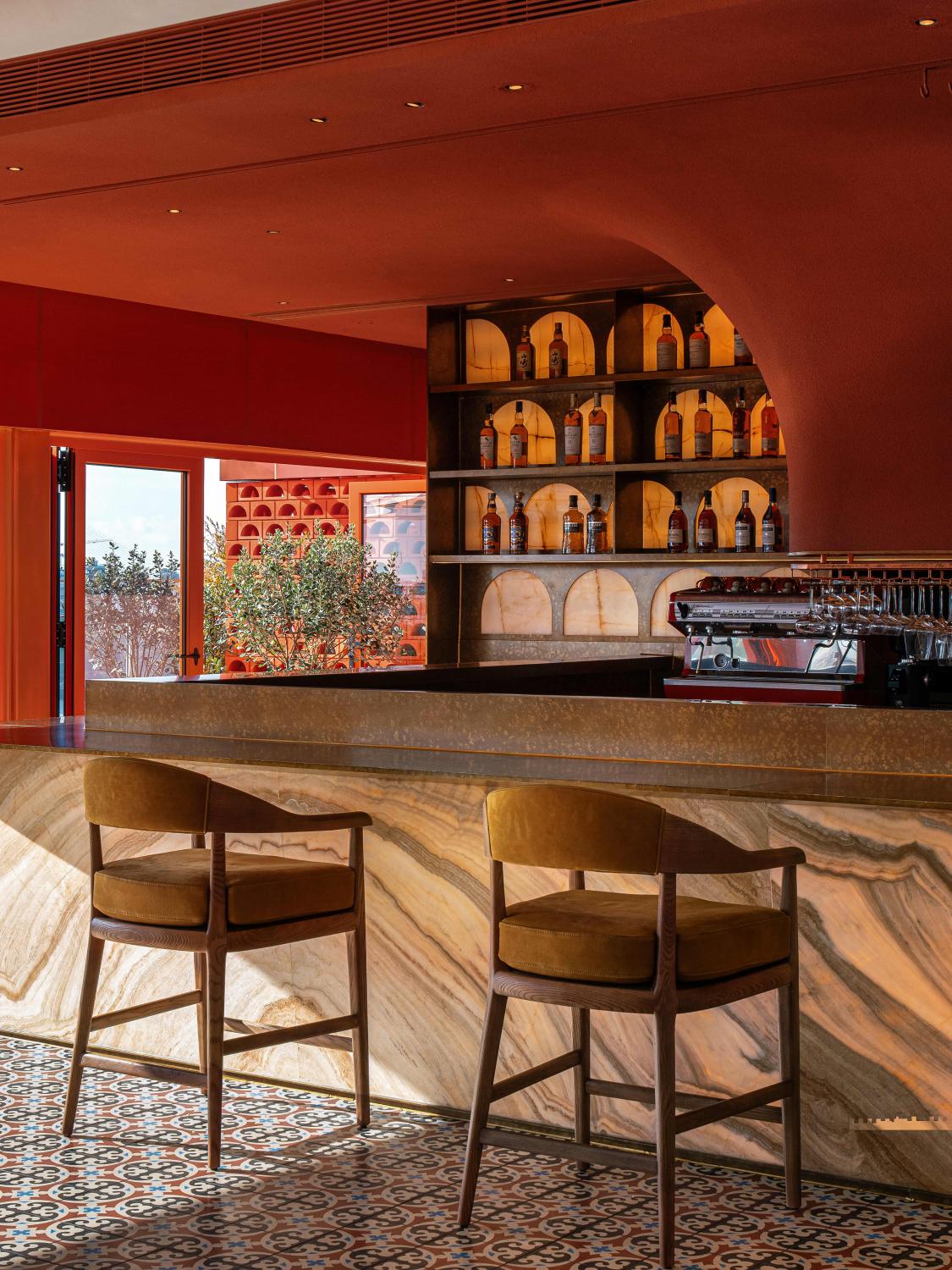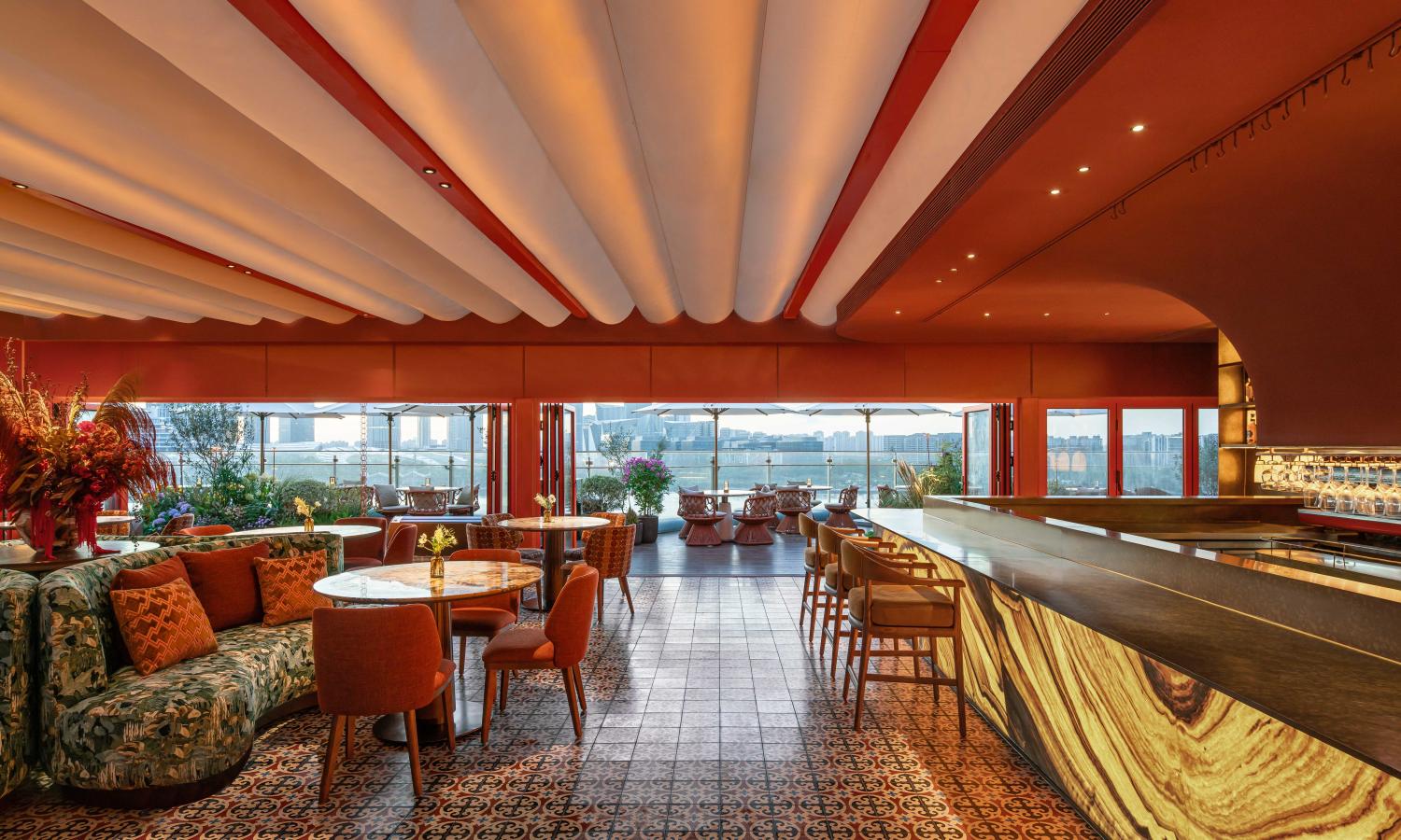 以西班牙南部的建筑精神与地中海的浪漫气息为灵感,构建一个凝聚阳光、色彩与人文温度的餐饮空间。空间以“拱形”与“赤陶”为核心语汇,延续西岸的艺术氛围,以当代设计手法重释地中海建筑的热烈与柔情。采用极简主义的现代手法重构设计,传统西班牙建筑是融合基督文化、伊斯兰文化与本土特色的建筑风格,注重自然元素与人文功能的结合,以多元文化交融与浪漫主义表达为特征,将其简化突出 “红陶筒瓦”的特征,拱形图案结合发泡陶瓷表现,以自然,天空作为最大的背景色,质朴的材料和阳光,空气作为调色盘,共同描绘出一幅自然活泼的画卷。